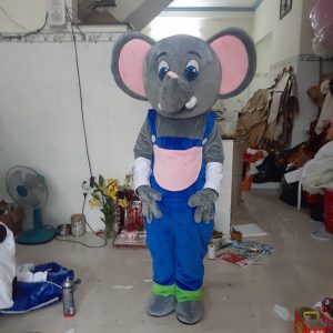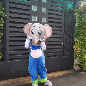 Mascot con voi gây ấn tượng với hình ảnh chú voi xám được nhân cách hóa và diện trang phục yếm quần màu xanh nổi bật.